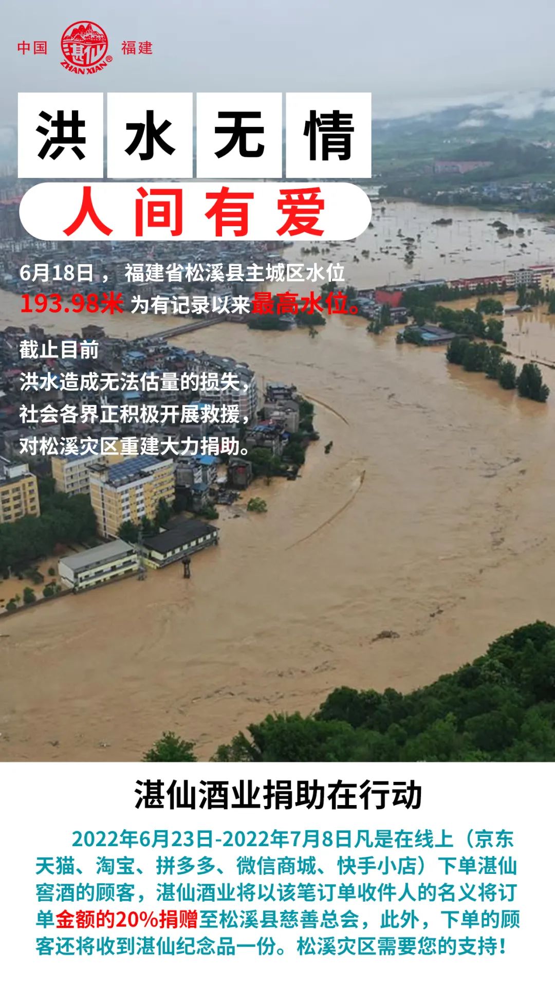 洪水无情,人间有爱。福建省湛仙酒业有限公司作为松溪本地知名企业,虽然在此次洪灾中也遭受巨大损失,但公司负责人赵宏博士看到家乡受灾,不仅第一时间捐款,同时还发动湛仙酒业助力松溪灾后重建捐助活动,承诺将从6月23日至7月8日期间湛仙酒业的线上销售额(京东、天猫、淘宝、拼多多、微信商城、快手小店)的20%捐献给松溪县慈善总会,帮助松溪县的灾后重建工作,尽快恢复生活和生产的秩序。