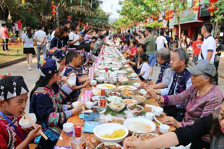 哈尼族人的“街心酒”,场面和规模都比较大,一般都有上百人参加。每到“昂玛突”节来临,哈尼族人会在山寨里摆上酒席,全寨人欢聚在一起饮酒、叙谈、祝福。街心酒宴象征团结、吉祥。街心酒,一般都选择村寨中较为宽阔的街心作为活动场所,酒宴集中展示了哈尼族的节日饮食、风俗礼仪、歌舞服饰等多方面的文化特色。