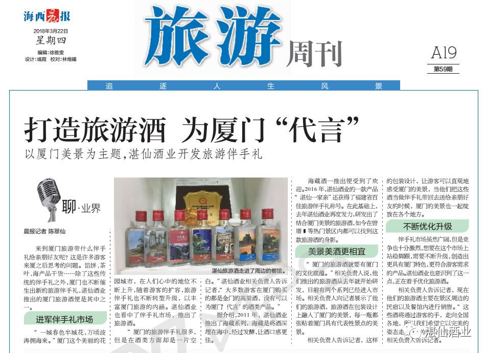 湛仙酒业今年推出的湛仙厦门旅游酒投放厦门市场以来,引起了媒体的注意,海西晨报旅游周刊头版专门对此进行了报道。